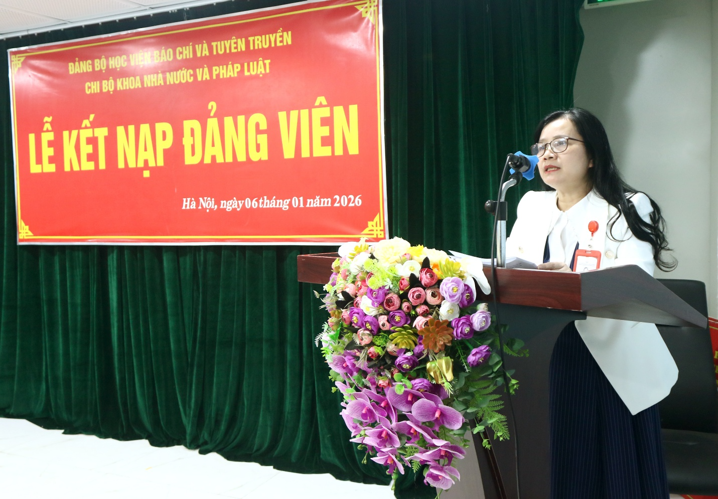 Phát biểu giao nhiệm vụ tại buổi Lễ, đồng chí Vũ Thị Thu Quyên, Bí thư Chi bộ Khoa Nhà nước và Pháp luật nhấn mạnh: Được đứng trong hàng ngũ đảng viên Đảng Cộng sản Việt Nam là một niềm vinh dự, tự hào lớn lao đối với cá nhân các đồng chí đảng viên, đó cũng là niềm vinh dự, tự hào của Chi bộ Khoa Nhà nước và Pháp luật trong công tác phát triển đảng viên. Đồng chí hy vọng, các đồng chí được kết nạp hôm nay sẽ tiếp tục cống hiến cho sự nghiệp đổi mới, tiến trình cách mạng của Đảng Cộng sản Việt Nam, luôn ghi nhớ và thực hiện tốt những nhiệm vụ của đảng viên, phát huy tinh thần tiên phong, gương mẫu của đảng viên, qua đó, thực hiện tốt Nghị quyết Chi bộ Khoa Nhà nước và Pháp luật nhiệm kỳ 2025-2027.