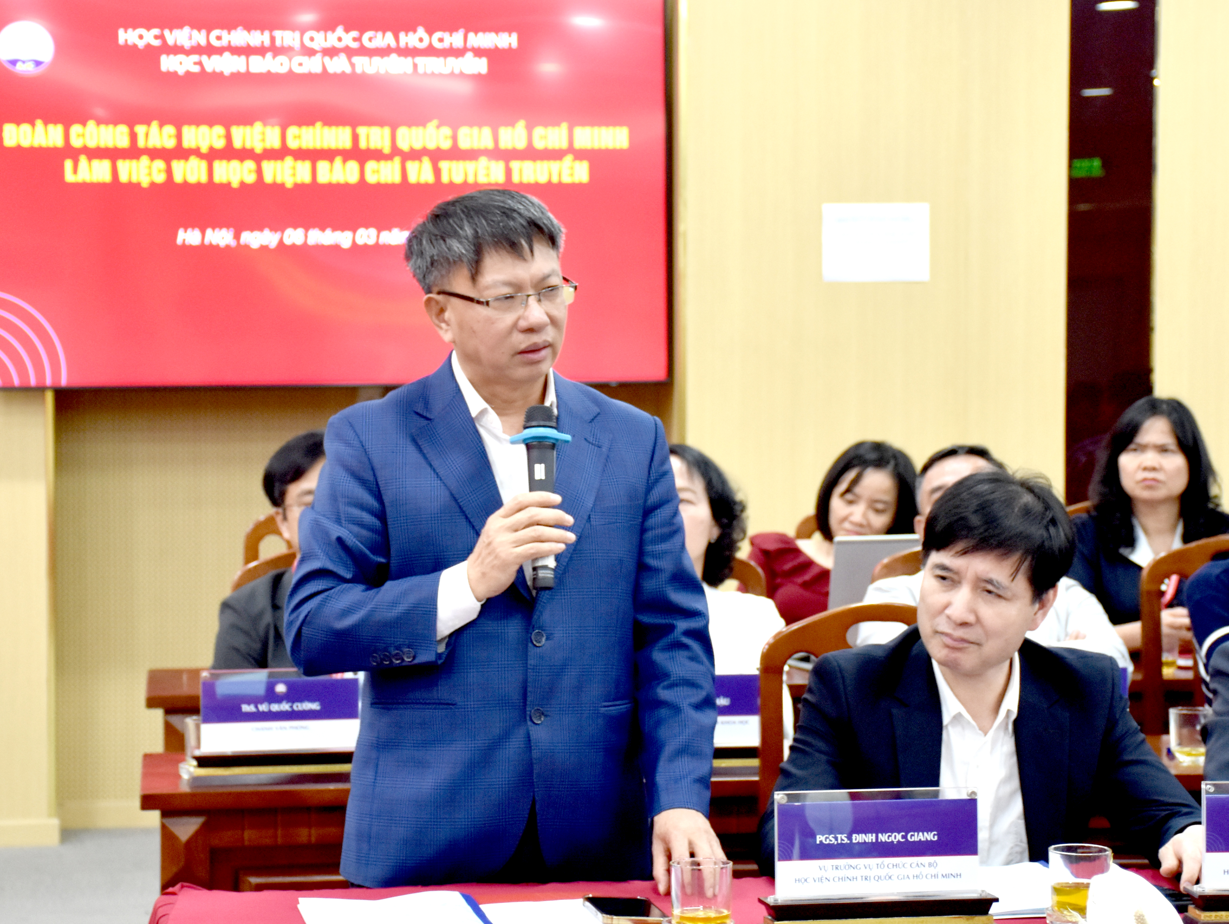 PGS,TS. Mai Đức Ngọc, Bí thư Đảng ủy Học viện Báo chí và Tuyên truyền phát biểu tại buổi làm việc