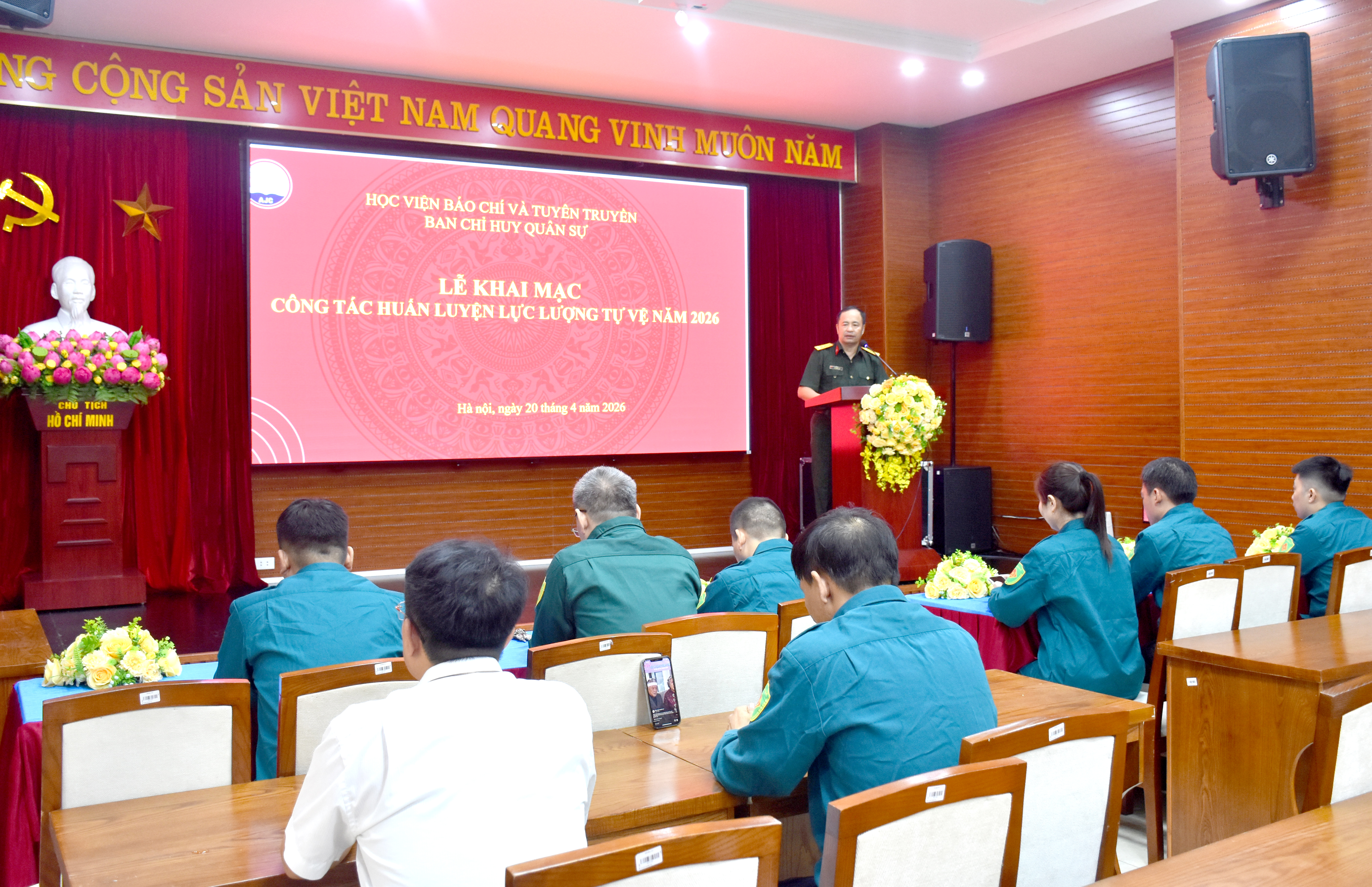 Sáng 20/4/2026, Học viện Báo chí và Tuyên truyền tổ chức Lễ khai mạc Công tác huấn luyện lực lượng tự vệ năm 2026 nhằm nâng cao chất lượng tổng hợp, khả năng sẵn sàng chiến đấu của lực lượng tự vệ, đáp ứng yêu cầu nhiệm vụ quốc phòng, quân sự địa phương trong tình hình mới.