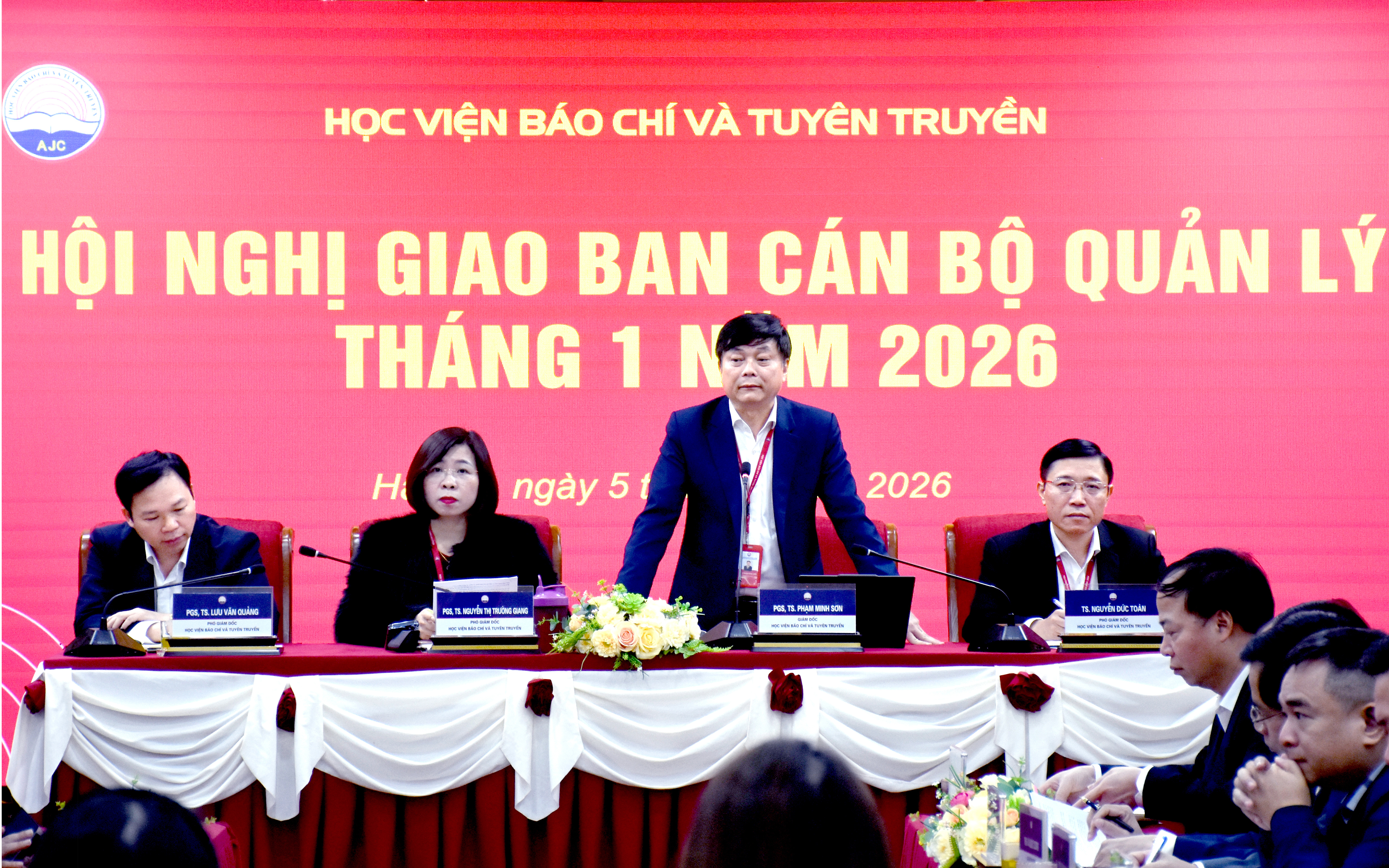 Sáng 05/01/2026, Học viện Báo chí và Tuyên truyền tổ chức Hội nghị giao ban cán bộ quản lý tháng 01 năm 2026 nhằm đánh giá tình hình, kết quả thực hiện nhiệm vụ tháng 12 năm 2025, đồng thời, thảo luận phương hướng, nhiệm vụ trọng tâm trong tháng 01 năm 2026 và thời gian tiếp theo.
