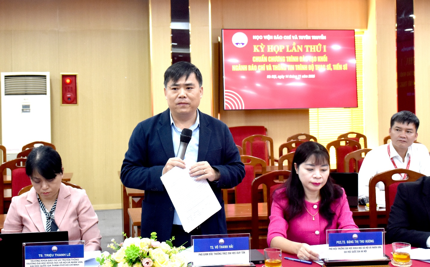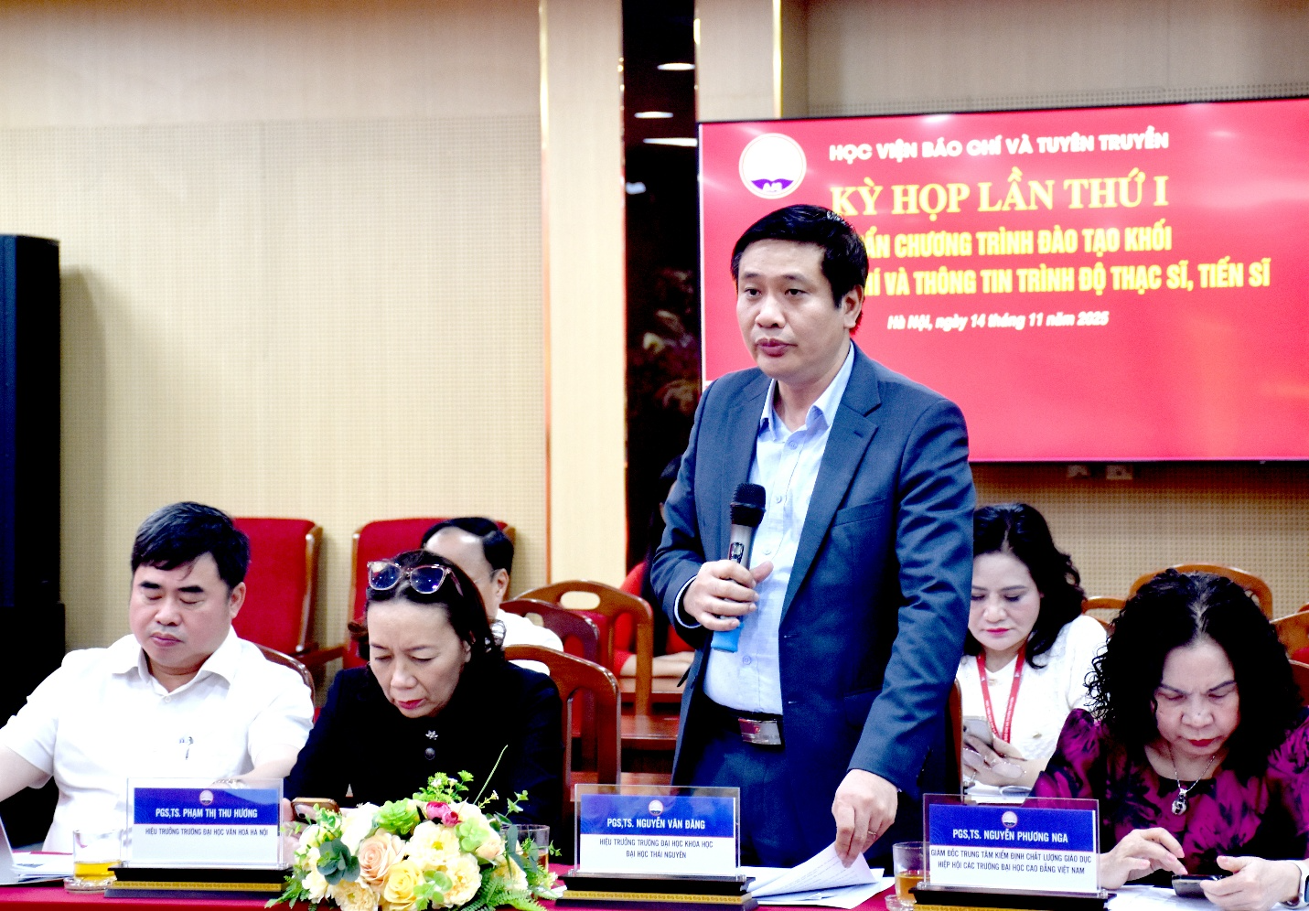 PGS, TS. Nguyễn Văn Đăng, Hiệu trưởng trường Đại học khoa học, Đại học Thái Nguyên trao đổi tại phiên họpKết luận phiên họp, PGS, TS. Phạm Minh Sơn đánh giá cao tinh thần trách nhiệm của các thành viên Hội đồng và thống nhất thông qua một số văn bản quan trọng sau khi được điều chỉnh theo tiến độ chung: Quy chế làm việc của Hội đồng, Kế hoạch xây dựng chuẩn chương trình đào tạo, Bảng phân công nhiệm vụ các thành viên, Lịch họp Hội đồng, Dự thảo lần 1 chuẩn chương trình đào tạo trình độ thạc sĩ, tiến sĩ khối ngành Báo chí và thông tin.