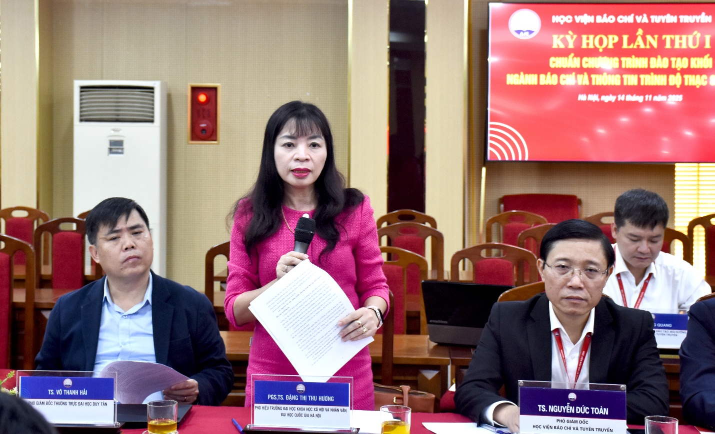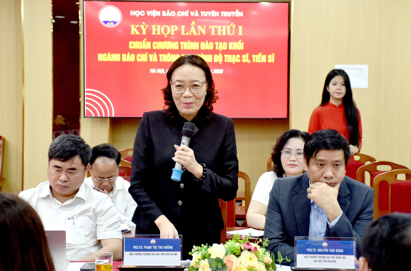 PGS, TS. Phạm Minh Sơn, Giám đốc Học viện Báo chí và Tuyên truyền, Chủ tịch Hội đồng tư vấn điều hành phiên họpĐại diện Ban chuyên môn và Ban thư ký, PGS, TS. Nguyễn Thị Trường Giang trình bày báo cáo kết quả nghiên cứu, rà soát và đề xuất hệ thống tiêu chuẩn đào tạo trình độ thạc sĩ, tiến sĩ. Báo cáo nhận được nhiều ý kiến góp ý chi tiết của các thành viên Hội đồng trong phiên họp.