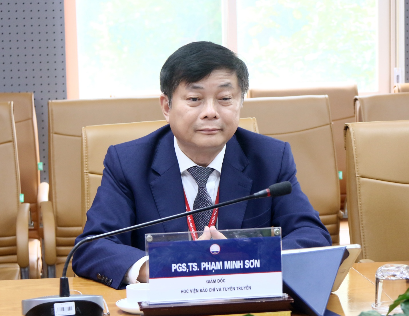 Phát biểu tại buổi làm việc, PGS,TS. Phạm Minh Sơn, Giám đốc Học viện đã giới thiệu khái quát về thế mạnh đào tạo và xu hướng phát triển của Học viện Báo chí và Tuyên truyền. Đồng thời, đồng chí bày tỏ niềm vinh dự khi được đón tiếp đoàn 10 nhà báo của CHDCND Lào – những người đang đảm nhận trọng trách trong các cơ quan tuyên huấn, báo chí và truyền thông của nước Cộng hòa Dân chủ Nhân dân Lào – đến thăm và làm việc tại Học viện.