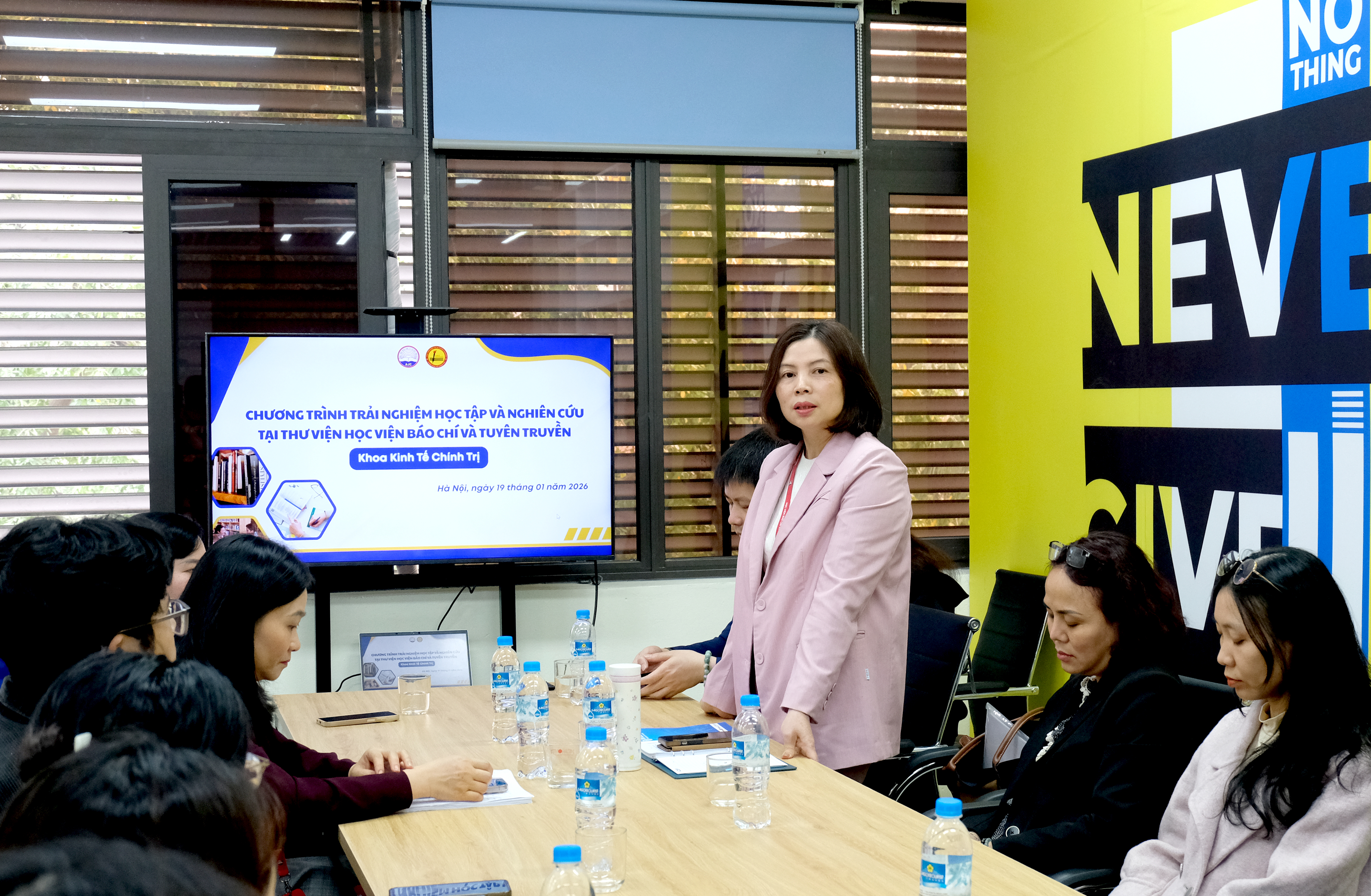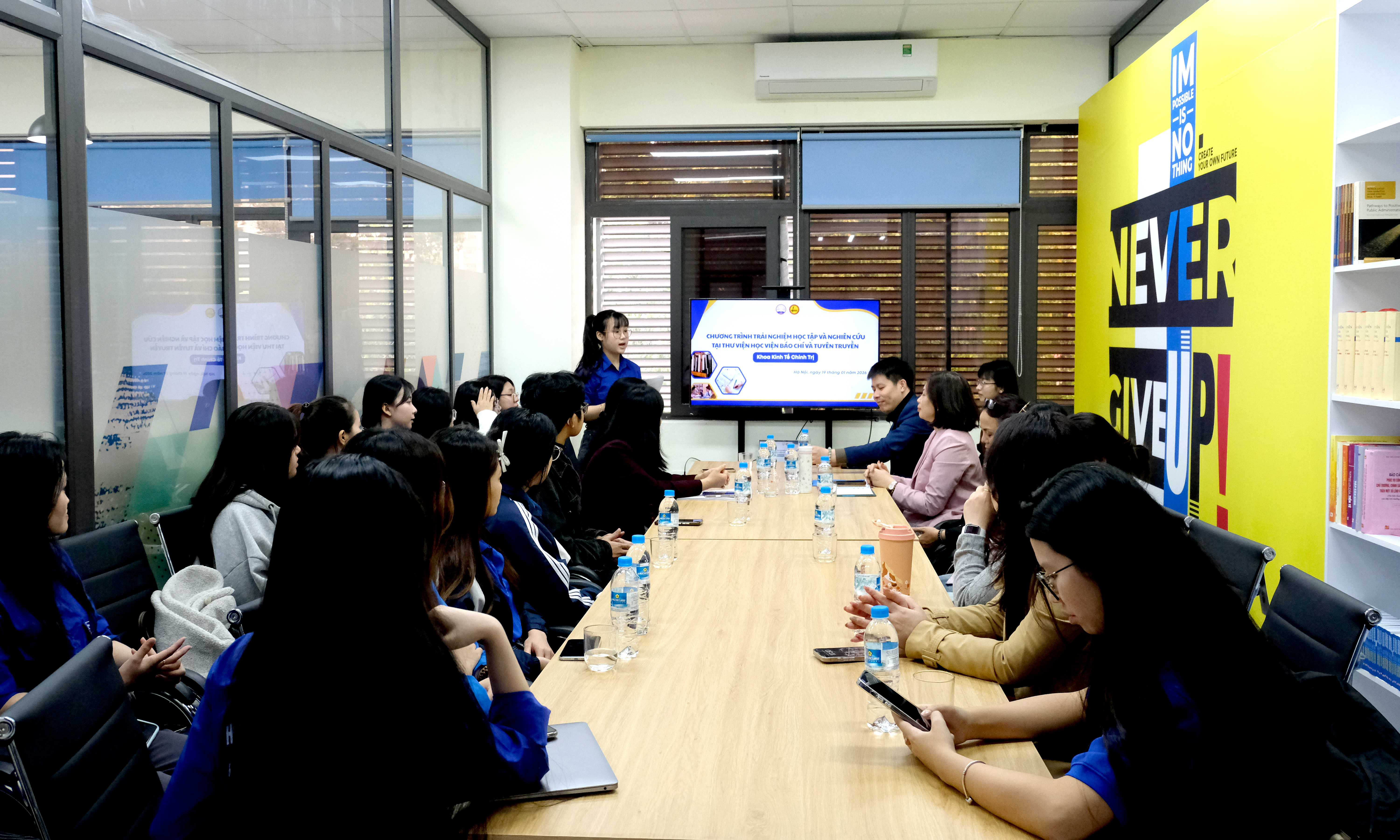 TS. Nguyễn Thị Khuyên phát biểu tại chương trìnhTrong ngày 2 ngày (ngày 20 và ngày 21/02), gần 900 sinh viên Khoa Kinh tế chính trị, chia thành 4 đợt, đã tham gia chương trình trải nghiệm học tập và nghiên cứu tại Trung tâm Thông tin khoa học. Tại chương trình, sinh viên được cán bộ Trung tâm phổ biến nội quy sử dụng Thư viện và trực tiếp trải nghiệm các không gian, dịch vụ học tập. Tại tầng 5 - không gian học tập mở, sinh viên được giới thiệu các khu vực sách, khu học nhóm, phòng thư viện số; hướng dẫn truy cập, tra cứu tài liệu số, sử dụng các thiết bị phục vụ học tập và tham quan khu trưng bày hiện vật lịch sử phát triển của Học viện. Tại tầng 4 - khu vực mượn tài liệu, sinh viên được hướng dẫn quy trình mượn - trả tài liệu tự động, sử dụng tài khoản thư viện, tìm hiểu khu vực đọc báo, tạp chí, tài liệu nội sinh (luận án, luận văn, đề tài khoa học) và khai thác phòng học nhóm.