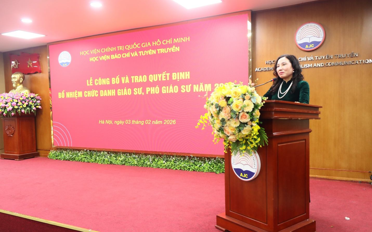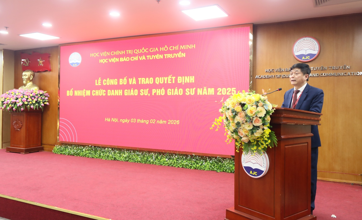 Sáng ngày 03/02/2026, Học viện Báo chí và Tuyên truyền tổ chức Lễ công bố và trao quyết định bổ nhiệm chức danh Giáo sư, Phó Giáo sư năm 2025 cho GS,TS. Trần Thị Minh Tuyết, giảng viên cao cấp Khoa Tư tưởng Hồ Chí Minh; PGS,TS. Nguyễn Thị Như Huế, Phó trưởng Ban Quản lý đào tạo, bồi dưỡng; PGS,TS. Vũ Thanh Vân, Giám đốc Trung tâm Thông tin khoa học.