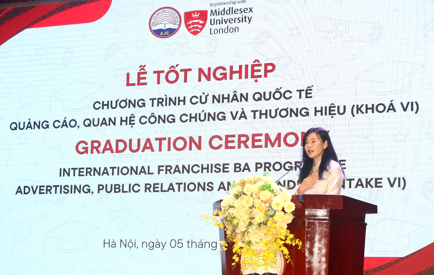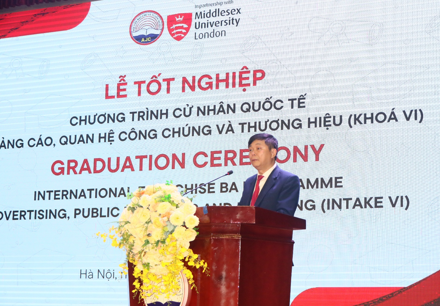 Phát biểu tại Lễ tốt nghiệp, PGS,TS. Phạm Minh Sơn, Giám đốc Học viện chúc mừng các tân cử nhân được nhận tấm bằng Cử nhân danh giá của Đại học Middlesex. Tấm bằng này là minh chứng cho thấy sinh viên đã đạt được những kiến thức, kỹ năng và phẩm chất cần thiết để bước vào môi trường truyền thông và thương hiệu chuyên nghiệp.