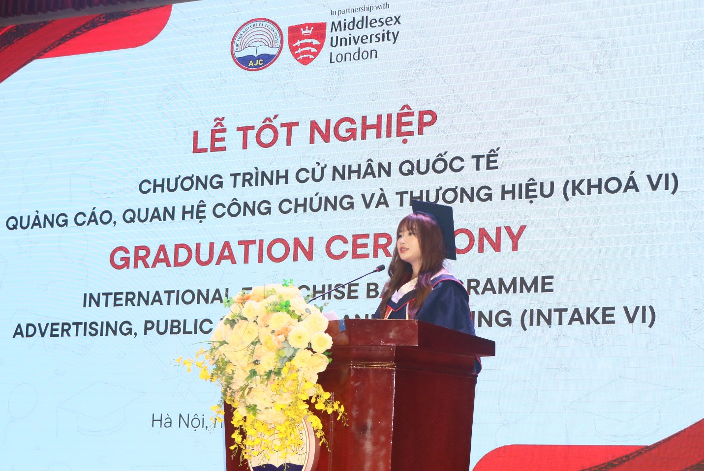 Sinh viên Phạm Trâm Anh, lớp Chuyên ngành 2022, đại diện sinh viên Chương trình Cử nhân quốc tế Quảng cáo, Quan hệ công chúng và Thương hiệu khóa VI phát biểu tại buổi Lễ tốt nghiệp