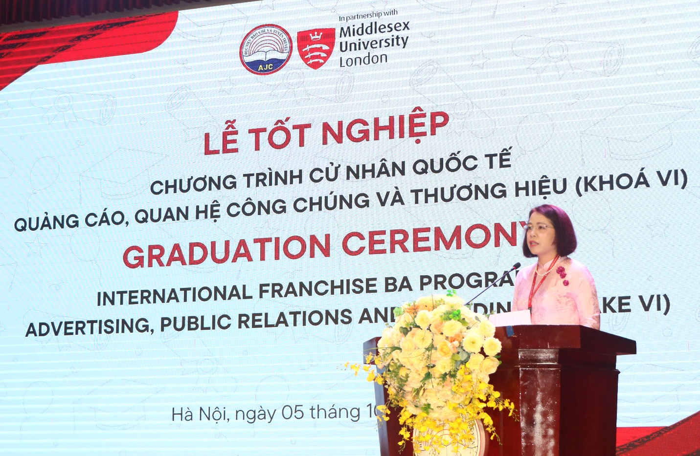 Phát biểu tại Lễ tốt nghiệp, bà Kay Yuen, Giám đốc đào tạo quốc tế khu vực Châu Á – Thái Bình Dương, Đại học Middlesex nhấn mạnh: Trong hơn 140 năm qua, Đại học Middlesex là nơi ươm mầm những tài năng sinh viên sáng tạo và đổi mới. Là sinh viên tốt nghiệp Middlesex, các em đủ điều kiện nhận học bổng 20% cho các chương trình sau đại học của Đại học Middlesex. Ngoài ra, Middlesex còn cung cấp học bổng Thành tích xuất sắc trị giá 50% học phí/năm cho những sinh viên thuộc cơ sở AJC trong vòng hai năm sau khi tốt nghiệp. Đối với những sinh viên đang cân nhắc việc học lên cao hơn tại London, Middlesex cung cấp một loạt chương trình sau đại học và các chương trình nghiên cứu ưu việt.
