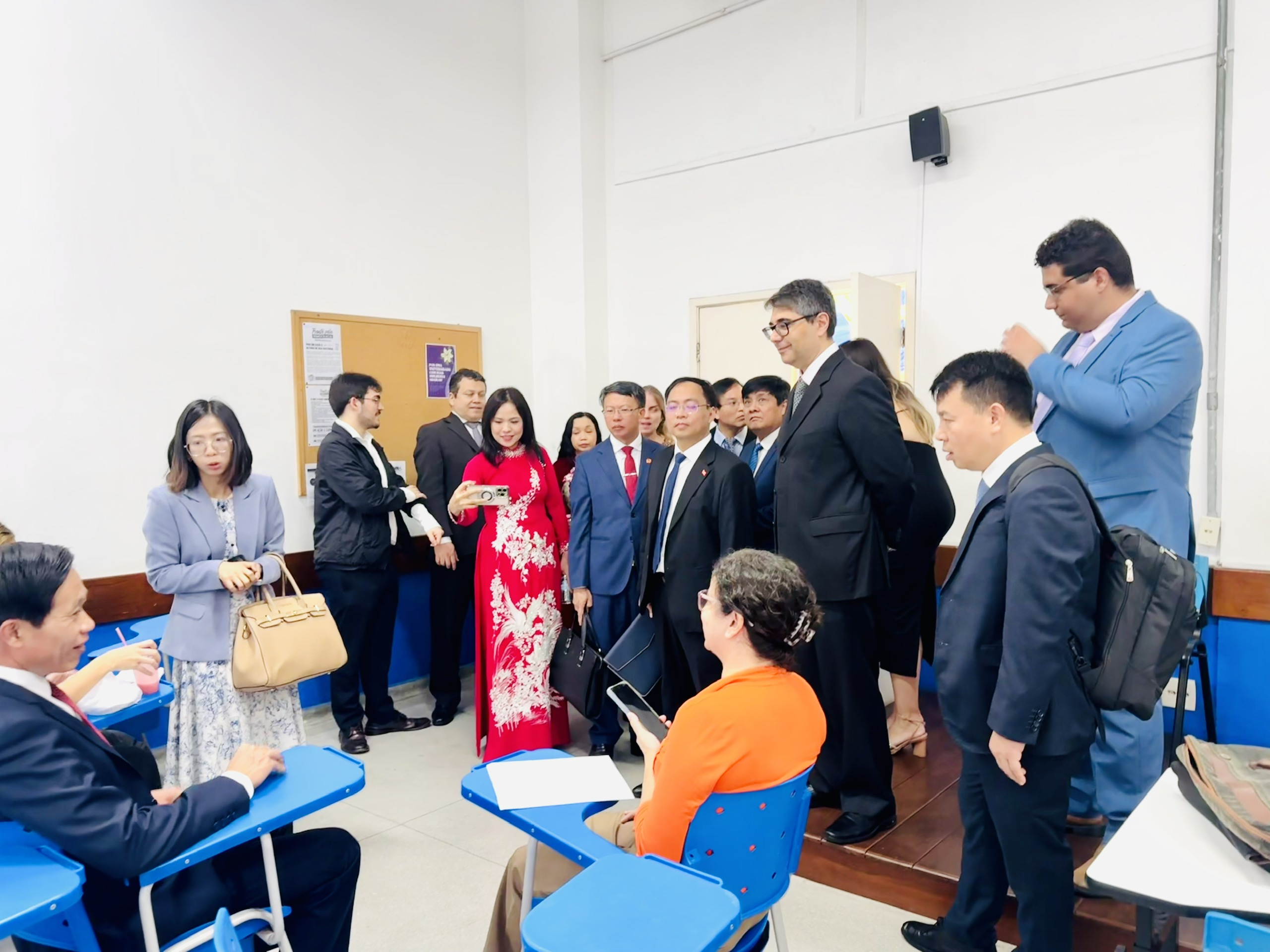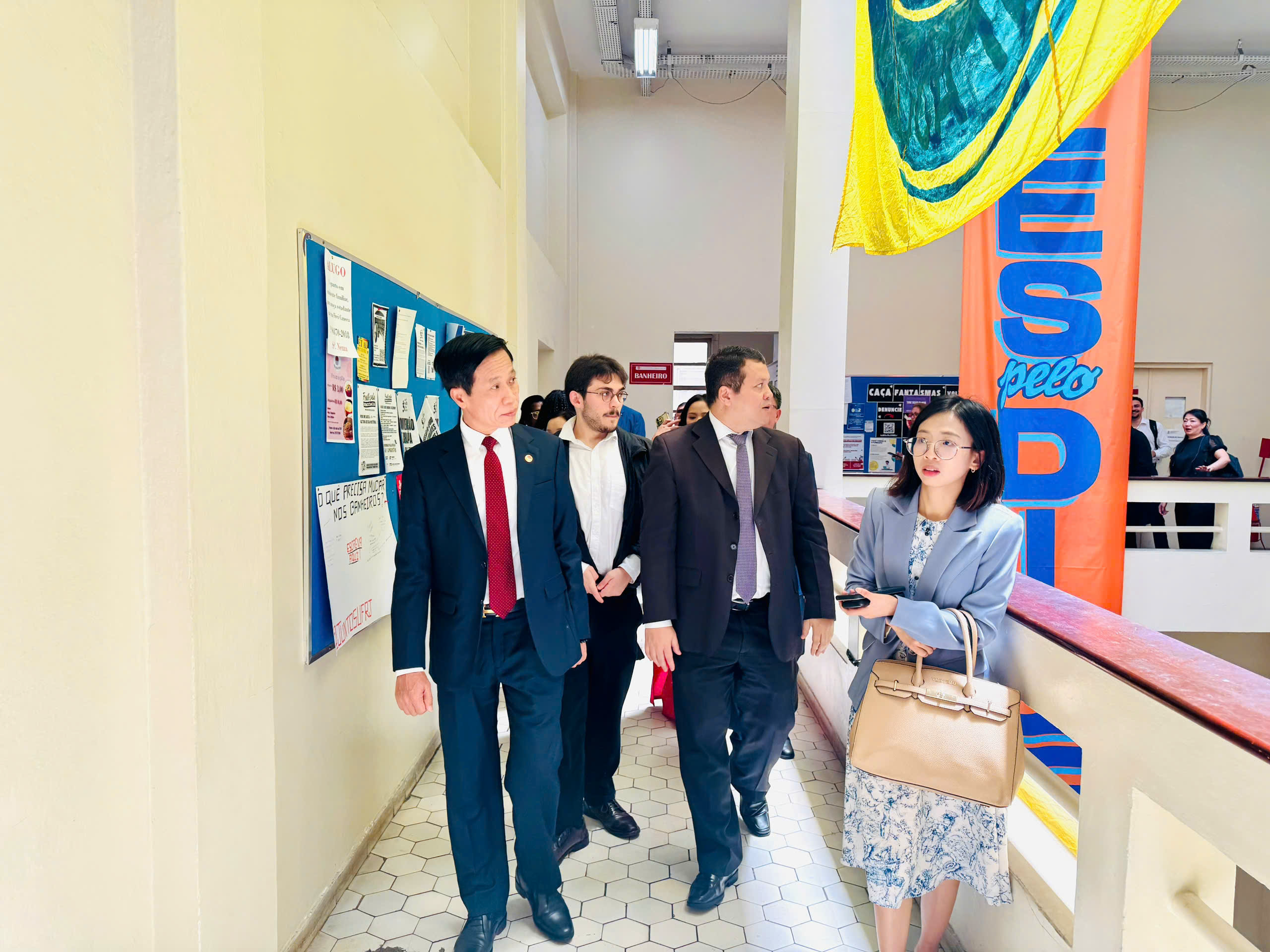 Đoàn công tác Học viện Chính trị quốc gia Hồ Chí Minh tham quan cơ sở vật chất, phòng học và khuôn viên Đại học Liên bang Rio de JaneiroBên cạnh các phiên làm việc và trao đổi học thuật, Đoàn công tác đã tham quan cơ sở vật chất của Đại học Liên bang Rio de Janeiro, tìm hiểu mô hình tổ chức, vận hành của nhà trường. Đoàn đã tới thăm khu hành chính, giảng đường, hệ thống thư viện trung tâm và các phòng học chức năng, nơi tích hợp nhiều công nghệ hiện đại phục vụ giảng dạy và nghiên cứu. Các thành viên trong đoàn đặc biệt quan tâm tới cách thức quản lý, số hóa và lưu trữ tư liệu của nhà trường, thể hiện rõ định hướng chuyển đổi số trong giáo dục đại học của Brasil. Hoạt động tham quan giúp Đoàn có thêm góc nhìn thực tế về công tác quản trị đại học, phát triển hạ tầng học tập thông minh và xây dựng môi trường giáo dục hiện đại, thân thiện với người học.