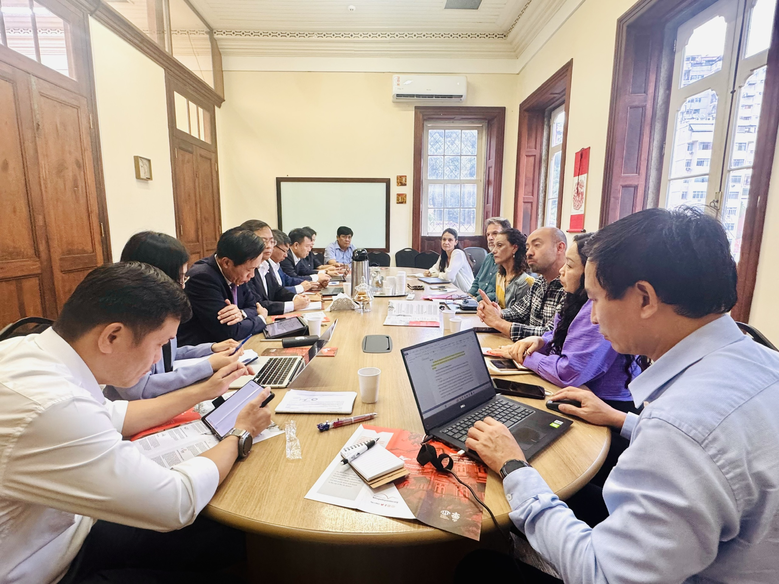 Toàn cảnh buổi làm việc giữa Đoàn Học viện Chính trị quốc gia Hồ Chí Minh và lãnh đạo, giảng viên Đại học Liên bang Rio de Janeiro (UFRJ)Đoàn công tác của Học viện cũng chia sẻ với các học giả Brasil về kinh nghiệm Việt Nam trong đổi mới mô hình đào tạo cán bộ, phát triển nguồn nhân lực lãnh đạo gắn với chuyển đổi số và kinh tế tri thức, cùng quan điểm của Việt Nam về xây dựng Nhà nước pháp quyền xã hội chủ nghĩa trong điều kiện hội nhập quốc tế sâu rộng. Cuộc trao đổi diễn ra cởi mở, mang tính học thuật cao, thể hiện tinh thần đối thoại bình đẳng và tôn trọng lẫn nhau giữa hai bên.