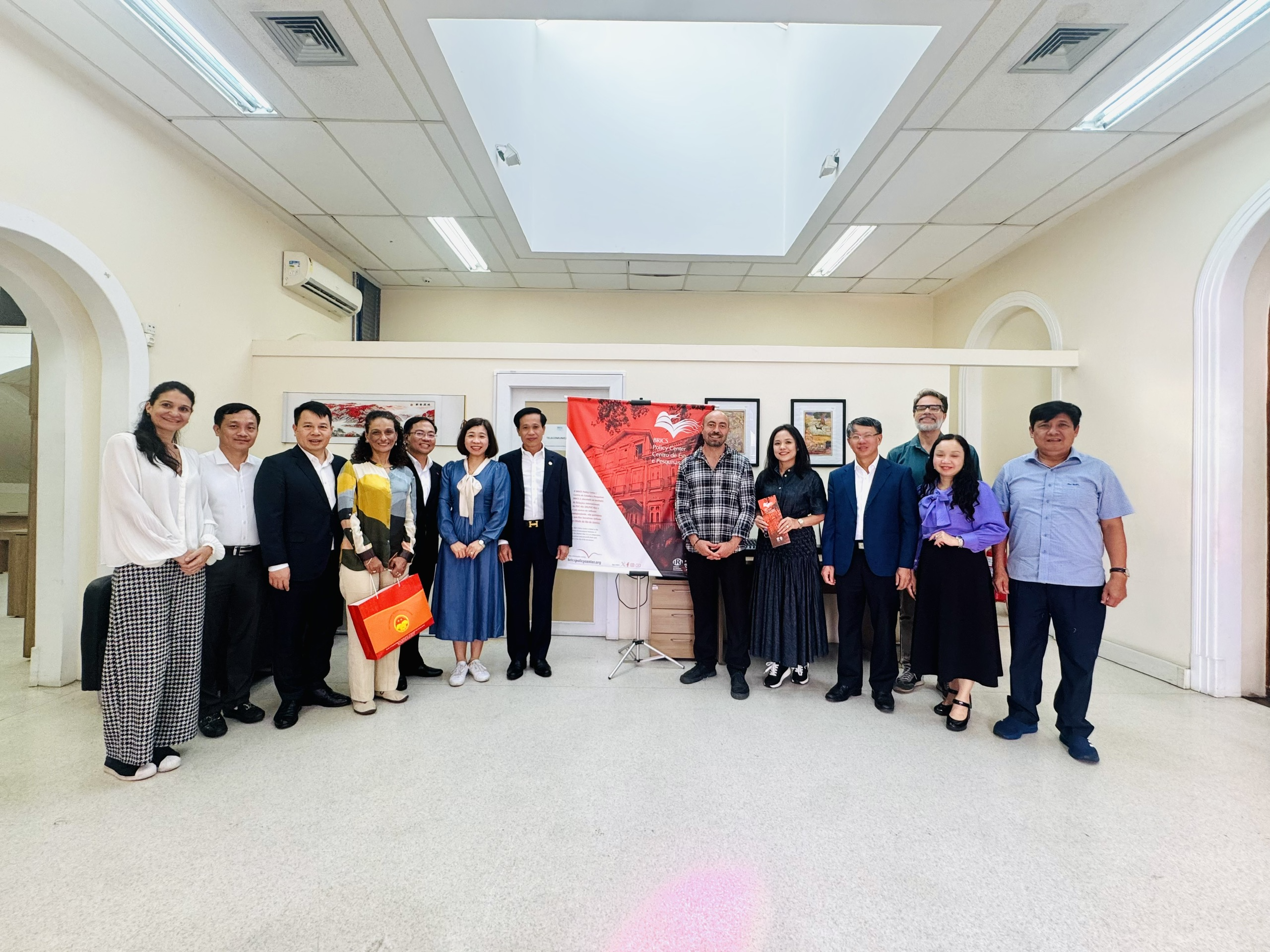 Đoàn công tác Học viện Chính trị quốc gia Hồ Chí Minh chụp ảnh lưu niệm cùng lãnh đạo và các nhà nghiên cứu của Viện Chính sách BRICS, BrazilCác thành viên của Đoàn Việt Nam đặt nhiều câu hỏi thực chất liên quan đến biến đổi khí hậu, tài chính xanh, công bằng môi trường và hợp tác học thuật. PGS, TS. Hoàng Phúc Lâm, đại diện lãnh đạo Học viện Chính trị quốc gia Hồ Chí Minh đề xuất ba hướng hợp tác cụ thể: tổ chức các khóa bồi dưỡng ngắn hạn tại Brazil, hỗ trợ nghiên cứu sinh Việt Nam và đồng tổ chức hội thảo quốc tế về phát triển bền vững, năng lượng và văn hóa. Phía Brazil hoàn toàn nhất trí, bày tỏ mong muốn ký kết Biên bản ghi nhớ (MOU) để chính thức hóa quan hệ hợp tác trong thời gian tới.