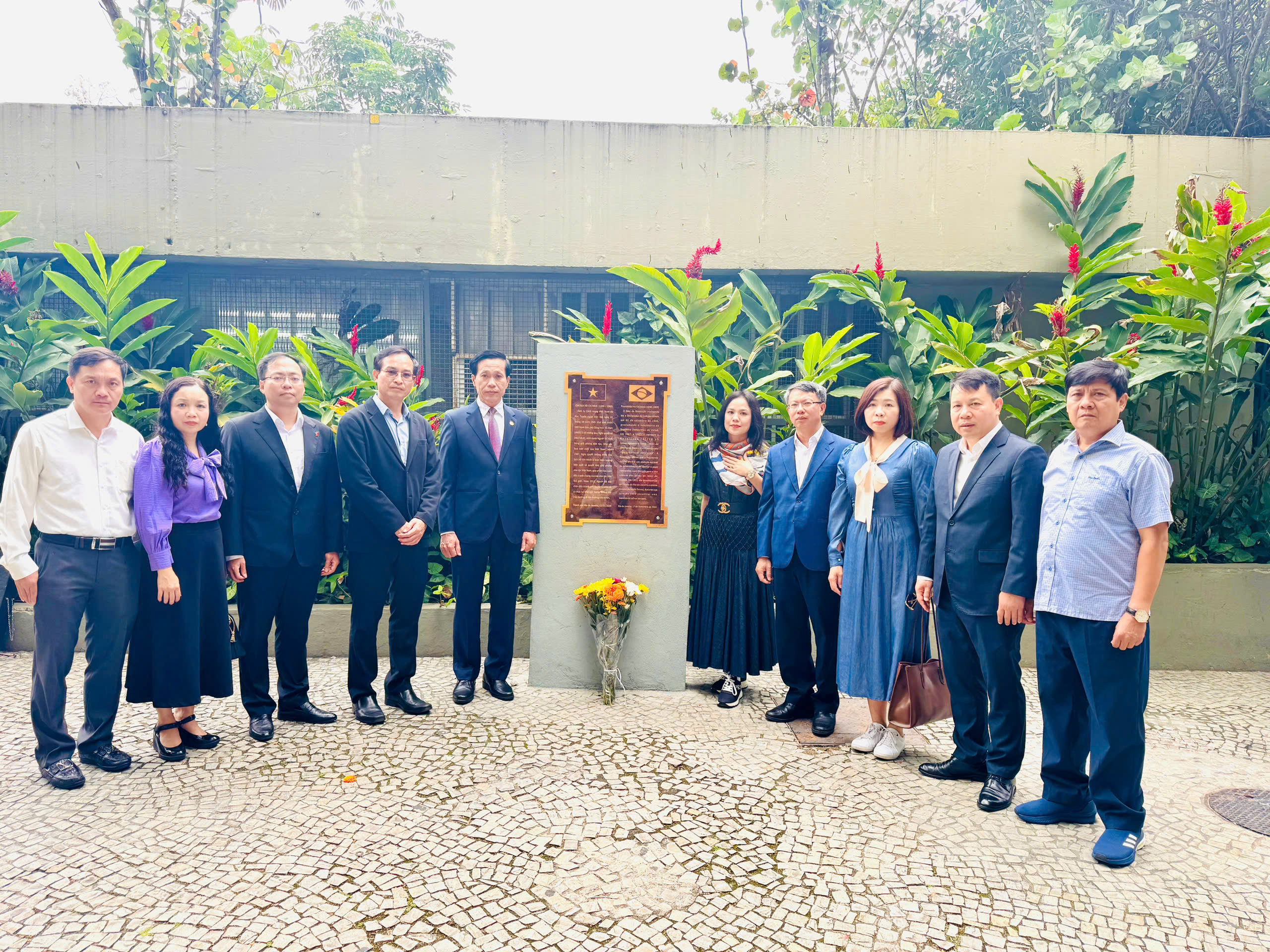 Đoàn công tác Học viện Chính trị quốc gia Hồ Chí Minh dâng hoa và chụp ảnh lưu niệm tại tấm bảng tưởng niệm Chủ tịch Hồ Chí Minh (1890-1969) ở khu phố Santa Teresa, thành phố Rio de Janeiro, BrasilTại khu phố Santa Teresa, thành phố Rio de Janeiro, Đoàn công tác đã đến viếng tấm bảng tưởng niệm Hồ Chí Minh - nơi ghi dấu mốc lịch sử khi Người có mặt tại Brasil năm 1912 trong hành trình tìm kiếm con đường cứu nước. Chính quyền và nhân dân của thành phố Rio cùng cộng đồng đã gìn giữ địa điểm này như biểu tượng cho tinh thần quốc tế và tình hữu nghị Việt Nam-Brasil. Tấm bảng được khắc song ngữ Việt - Bồ Đào Nha, công nhận Hồ Chí Minh là “Anh hùng giải phóng dân tộc, danh nhân văn hóa kiệt xuất của Việt Nam” và ghi rõ rằng thân thế và hành trình của Người đã góp phần vun đắp mối quan hệ hữu nghị lâu đời giữa hai quốc gia. Hình ảnh Đoàn Việt Nam dâng hoa tại nơi lưu lại dấu chân lãnh tụ không chỉ thể hiện lòng thành kính và tự hào dân tộc mà còn khẳng định sự kết nối sâu sắc về lịch sử, văn hóa và giá trị nhân văn giữa Việt Nam và Brasil. Đây là một hoạt động mang ý nghĩa rất lớn về mặt biểu tượng, góp phần làm sâu sắc hơn hình ảnh Học viện Chính trị quốc gia Hồ Chí Minh - cơ sở nghiên cứu, đào tạo cán bộ lãnh đạo của Việt Nam trong công tác đối ngoại, hợp tác quốc tế và giao lưu văn hóa.