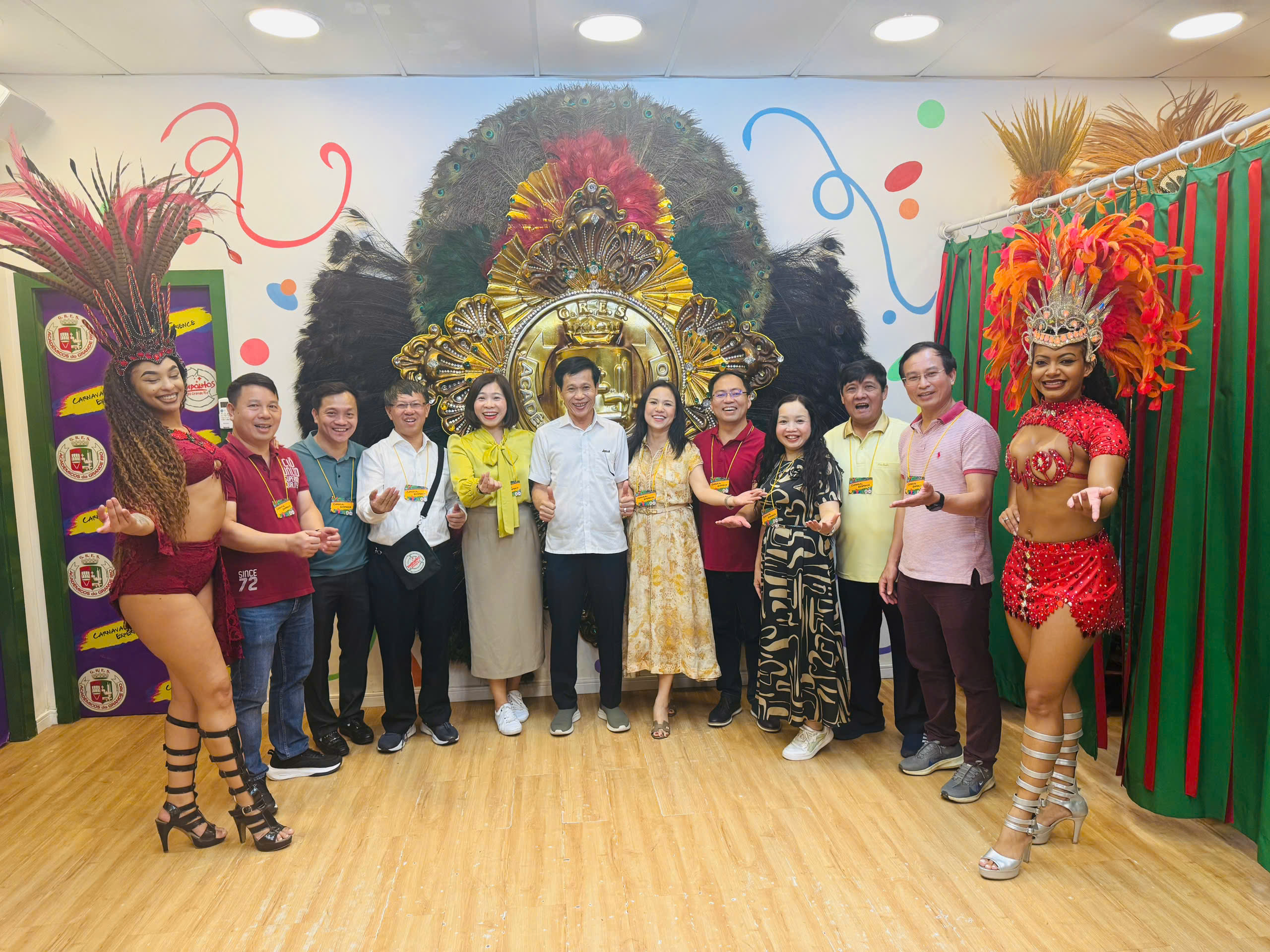 Đoàn công tác tham quan và tìm hiểu quy trình sáng tạo tại trường đào tạo Samba Grande Rio - trung tâm tổ chức Lễ hội Carnival nổi tiếng thế giới ở thành phố Rio de JaneiroLễ hội Carnival tại Rio de Janeiro không chỉ là một sự kiện tung hoành đường phố với hàng triệu người tham dự mỗi năm mà còn là một chuỗi hoạt động sáng tạo và tổ chức chuẩn bị cả năm trời, nơi mà nghệ thuật, kỹ thuật, kinh tế và văn hóa hội tụ. Khởi nguồn từ lễ hội Entrudo do người Bồ Đào Nha đưa vào vào thế kỷ 17 và 18, Carnival đã tiến hóa thành một biểu tượng toàn cầu với các trường Samba chuyên nghiệp, những đoàn diễu hành khổng lồ, và hoạt động chuẩn bị đáng kinh ngạc. Đoàn công tác của Học viện đã được trải nghiệm “hậu trường” của lễ hội tại trung tâm sản xuất của trường Samba Grande Rio - nơi các xe diễu hành khổng lồ được dựng và trang trí, hơn 3.000 bộ trang phục lộng lẫy được may sẵn, và từng bước khiêu vũ, nhịp trống samba, âm thanh batucada rất bài bản. Chính mỗi trường Samba không chỉ là nhóm biểu diễn mà còn là “nhà máy” sáng tạo và tổ chức: mỗi năm họ xây dựng chủ đề, vẽ phác thảo, thiết kế, đóng khung kịch bản, dựng phông nền, huy động thợ gỗ, thợ sắt, thợ may, nhà thiết kế ánh sáng và hàng trăm tình nguyện viên và tất cả đều chuẩn bị cho những đêm diễu hành chính tại Sambódromo. Đây cũng là cách Brasil biến văn hóa nền tảng thành ngành công nghiệp văn hóa hiện đại, từ việc khai thác thương mại, du lịch, truyền thông, tới vai trò xã hội của các trường Samba trong cộng đồng địa phương. Việc Đoàn Việt Nam trực tiếp quan sát quá trình này là một cơ hội quý để nhìn thấy cách văn hóa, sáng tạo và kinh tế kết hợp thành chiến lược phát triển, từ đó lấy cảm hứng cho Việt Nam trong việc phát triển ngành công nghiệp văn hóa, bảo tồn di sản và kích thích sáng tạo trong bối cảnh hội nhập quốc tế.