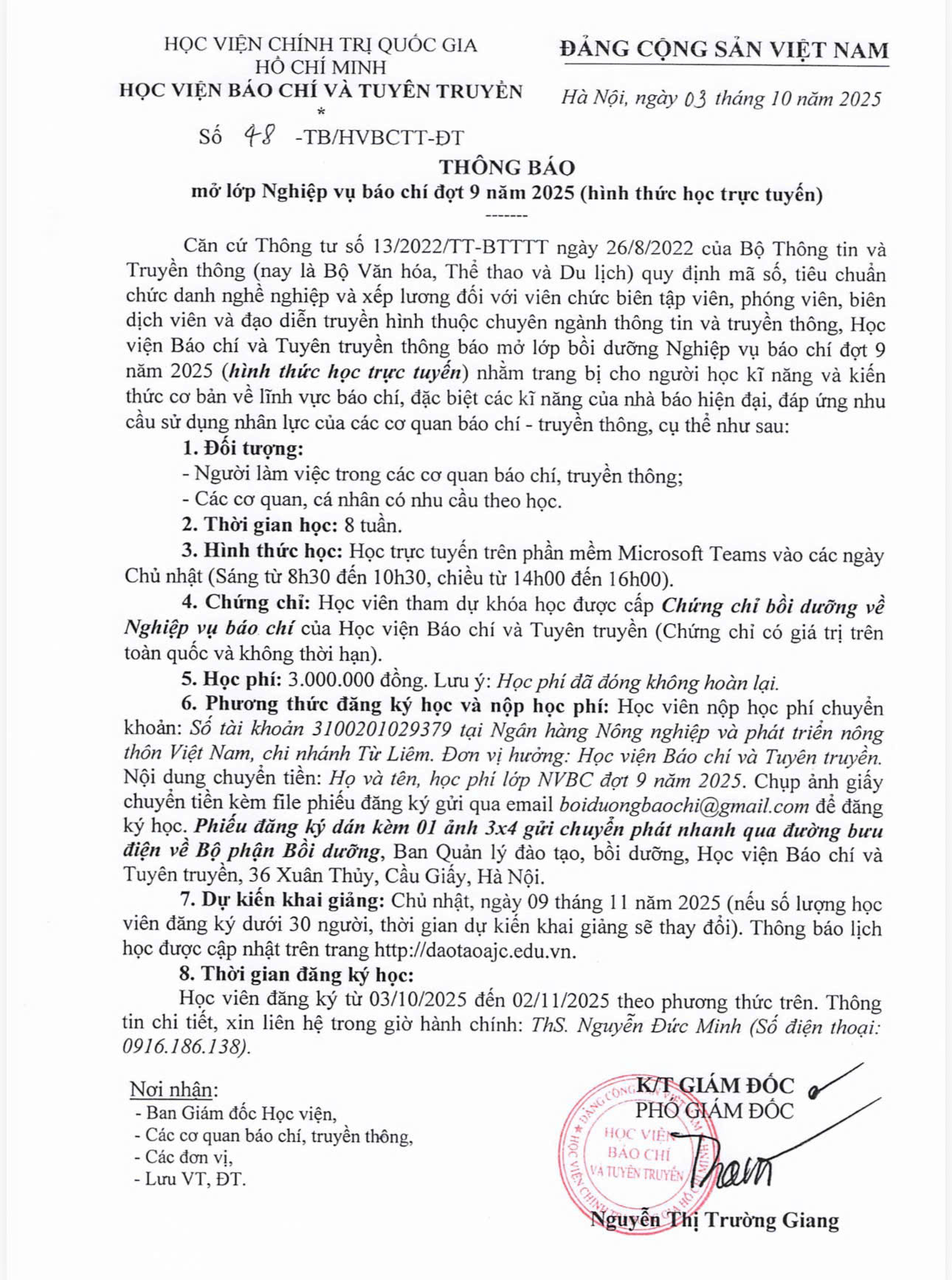 Học viện Báo chí và Tuyên truyền thông báo mở lớp Nghiệp vụ báo chí đợt 9 năm 2025 (hình thức học trực tuyến) cụ thể như sau: