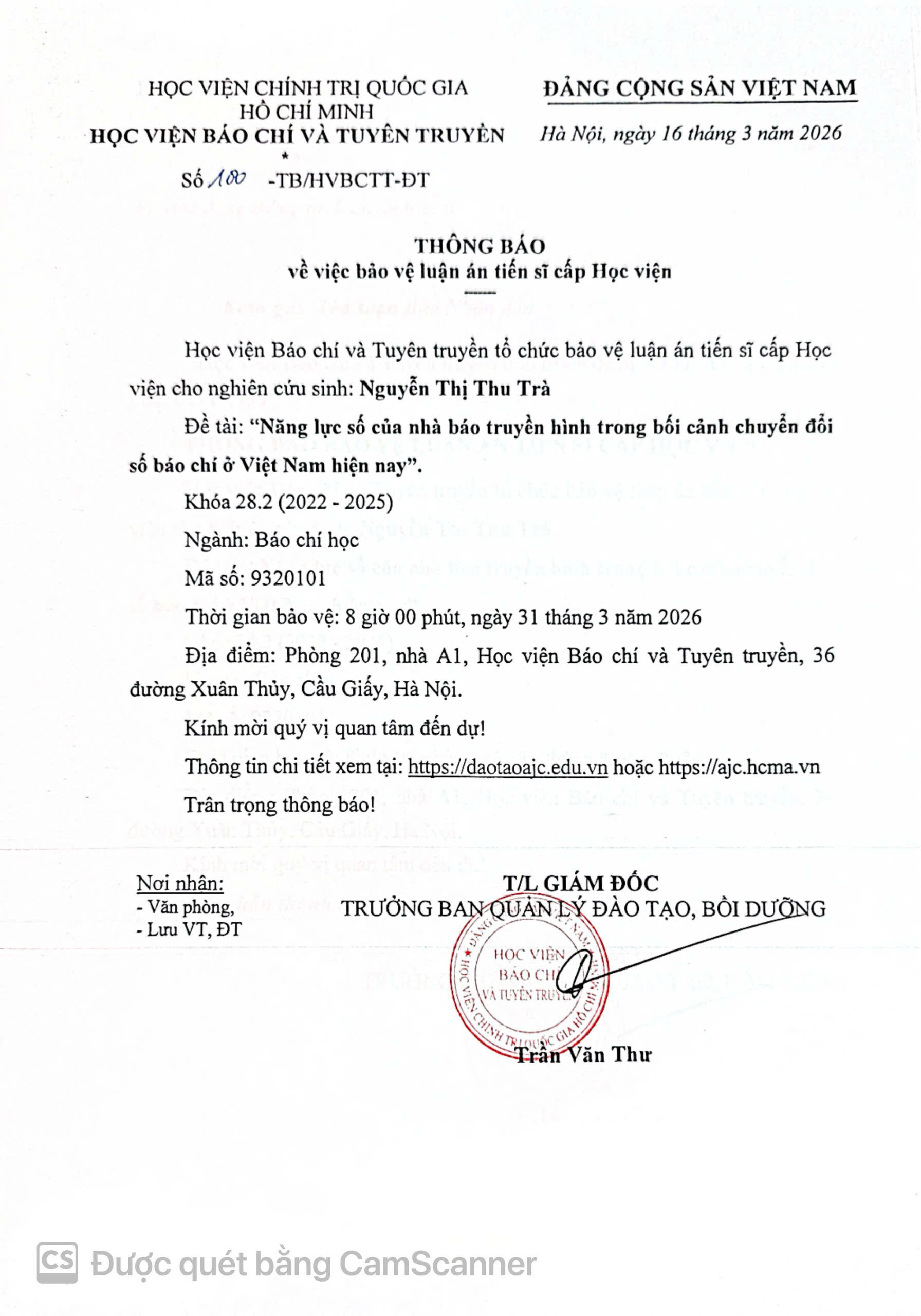 Học viện Báo chí và Tuyên truyền thông báo về việc bảo vệ luận án tiến sĩ cấp Học viện của nghiên cứu sinh Nguyễn Thị Thu Trà cụ thể như sau: