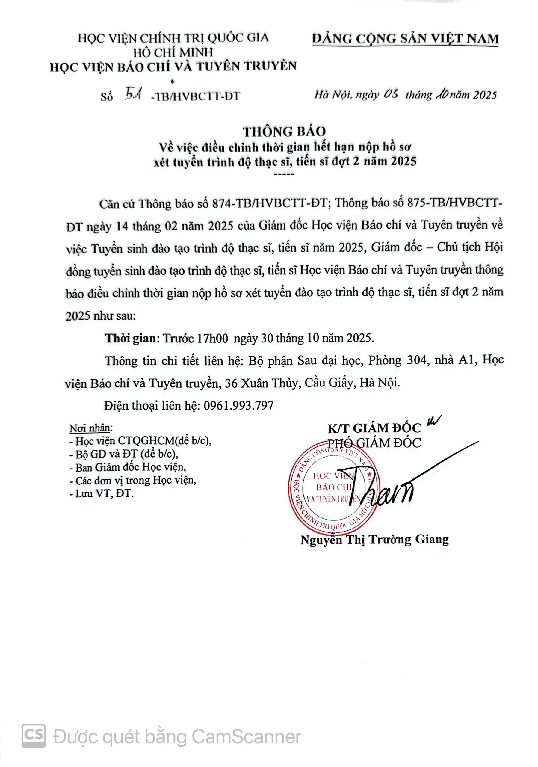 Học viện Báo chí và Tuyên truyền thông báo về việc điều chỉnh thời gian hết hạn nộp hồ sơ xét tuyển trình độ thạc sĩ, tiến sĩ đợt 2 năm 2025 cụ thể như sau: