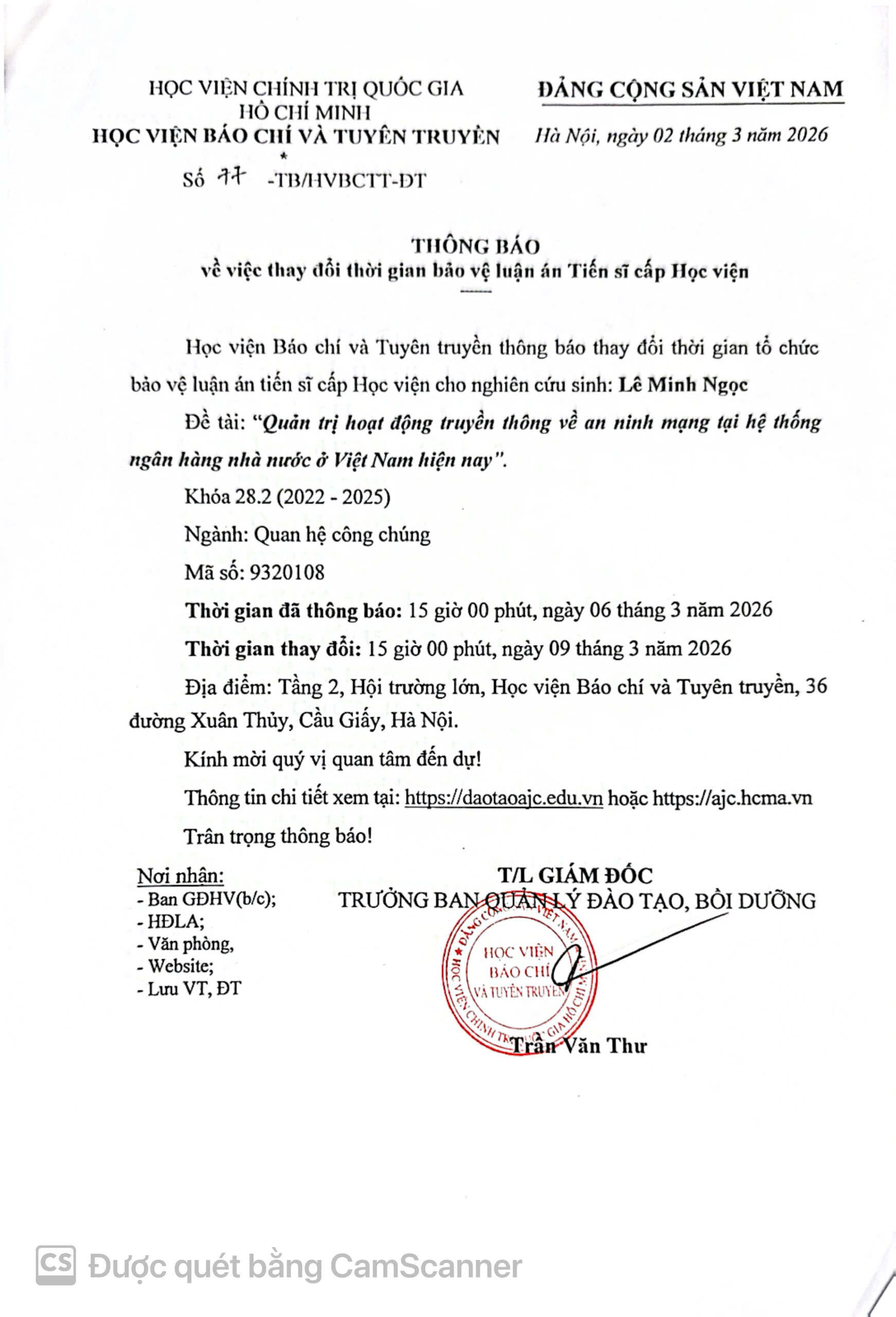 Học viện Báo chí và Tuyên truyền thông báo về việc thay đổi thời gian bảo vệ luận án tiến sĩ cấp học viện của nghiên cứu sinh Lê Minh Ngọc cụ thể như sau: